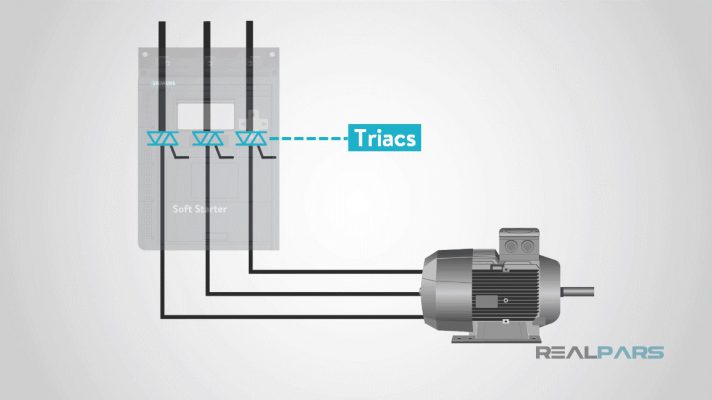 Khởi động mềm gồm 3 cặp thyristor (SCR) đấu song song ngược nhau. Ở trạng thái ngắt điện, thyristor ngăn không cho dòng điện chạy qua, khi ở trạng thái mở, thyristo mở dần góc kích (góc mở của các van bán dẫn) cho phép dòng điện chạy qua từ từ, động cơ bắt đầu khởi động và tăng tốc dần. Điện áp được điều khiển bằng cách điều khiển góc mở của van. Khi van mở hoàn toàn, điện áp đạt đến giá trị điện áp định mức và lúc đó động cơ sẽ đạt đến tốc độ tối đa cho phép. Vì mô-men động cơ tỉ lệ với bình phương điện áp, dòng điện tỉ lệ với điện áp, mô-men gia tốc và dòng điện khởi động được hạn chế thông qua điều chỉnh trị số hiệu dụng của điện áp.